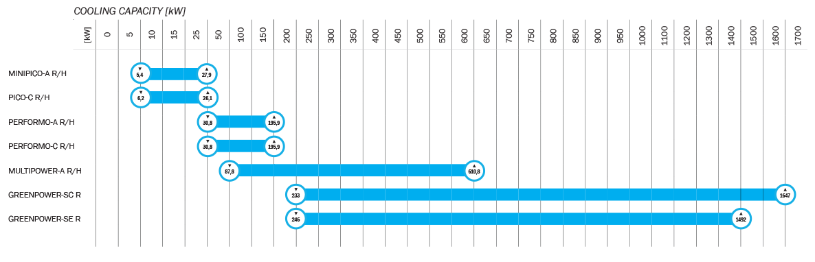 این سری دستگاه شامل 18 سایز چیلر هواخنک ( Heat Pump و بدون آن ) به همراه فن Axial با ظرفیت سرمایشی 90 - 610 کیلووات با گاز مبرد R410A می باشد.