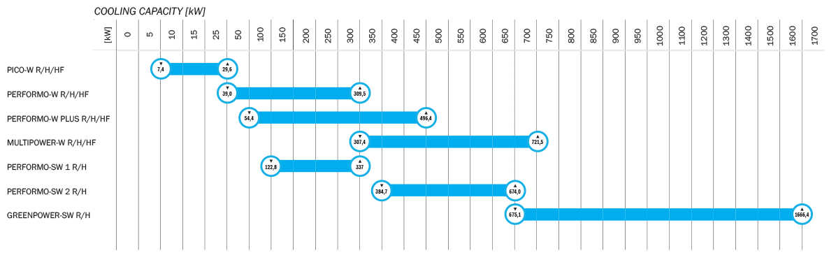 این سری دستگاه شامل 11 سایز چیلر آب خنک با ظرفیت سرمایشی 675 - 1665 کیلووات با گاز مبرد R134a می باشد.