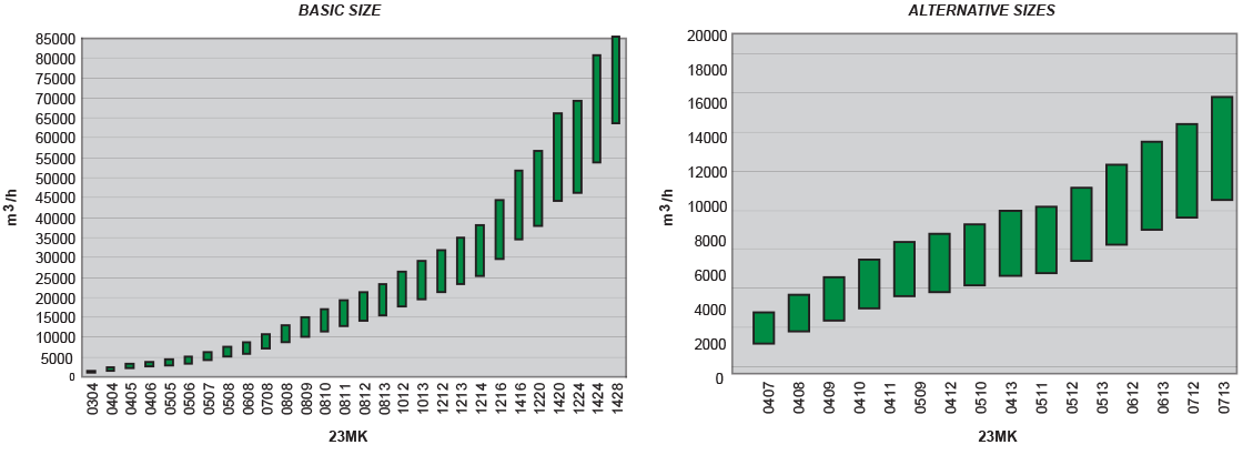 سری هوارسانهای 23 MK امکانات گسترده ایی را در انتخاب قطعات لازم جهت ایجاد تهویه مطبوع در اختیار مصرف کننده قرار می دهد بطوریکه مصرف کننده میتوان مطمئن ترین شرایط سرمایش و گرمایش و هوای پاک را با این دستگاه تجربه نماید. سری 23 MK در 44 سایز و در رنج ظرفیتی 1,000 تا 80,000 متر مکعب (0.278 تا 22.222 مترمکعب در ثانیه) و با فشار استاتیک تا 2500 پاسکال قابل ارائه می باشند. توضیح اینکه در ظرفیتهای و فشار های بالاتر این دستگاهها طبق سفارش قابل ارائه می باشند. در ساخت این دستگاهها مفهوم Modularity بکار رفته است بطوریکه در 28 سایز دستگاه ارتفاع و پهنای دستگاه ضریبی از 160mm بوده و در 16 سایز دیگرسعی در کاهش ارتفاع شده است. در طراحی سری 23 MK سعی در کاهش ارتفاع جهت قرارگیری در فضاها صورت گرفته و این موضوع باعث ظاهر نمایی مستطیلی دستگاه شده است که مطلب کمک شایانی به طراحان در فضاهای نصب خاص می شود. در کنار کاهش ارتفاع دستگاهها ( تا ظرفیت 10,000 مترمکعب در ساعت ارتفاع دستگاه بین 670-830 میلیمتر می باشد) که در طراحی دستگاه مد نظر ما بوده مشتریان میتوانند با حذف سفارش شاسی دستگاه از ارتفاع دستگاه به میزان 120mm کم نموده بطوریکه ارتفاع نهایی بین 550 تا 710 میلیمتر می گردد. این موضوع امکان نصب دستگاه را به نوع سقفی ایجاد می نماید.